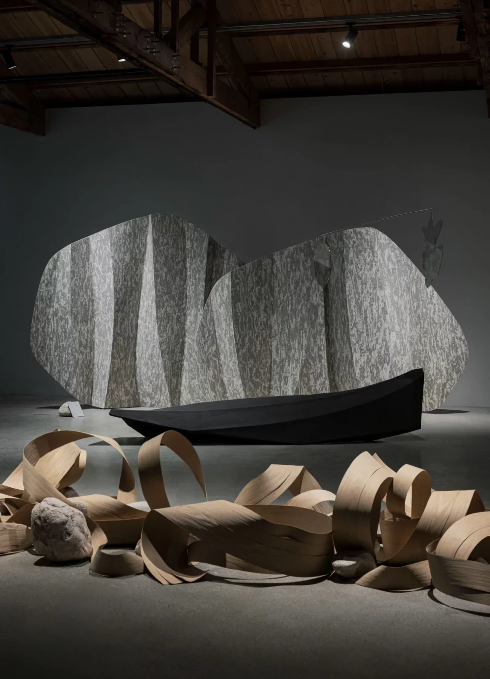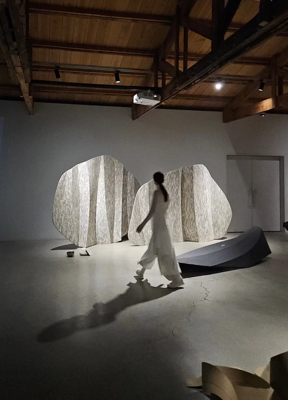 The geographic characteristics of the work, which are rich in rocks, express the strong and bold energy felt from them through a folding screen with irregular lines and surfaces, and the wind of gaining energy from the moon and sending wishes are expressed through a round and fluid mobile. The black mass on the floor balances the center of each medium.
