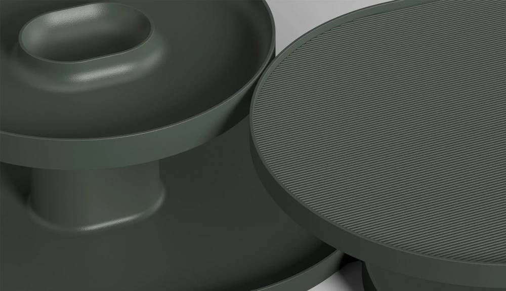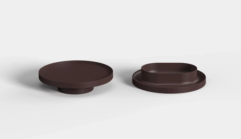 The JAJU Tray Series consists of a set of trays based on basic geometric shapes: a round tray, a square tray, and a two-tiered tray. These trays include compartments created by derived shapes acting as dividers. When flipped, each tray transforms into a plate with a raised base, with the dividers serving as the plate's support structure.