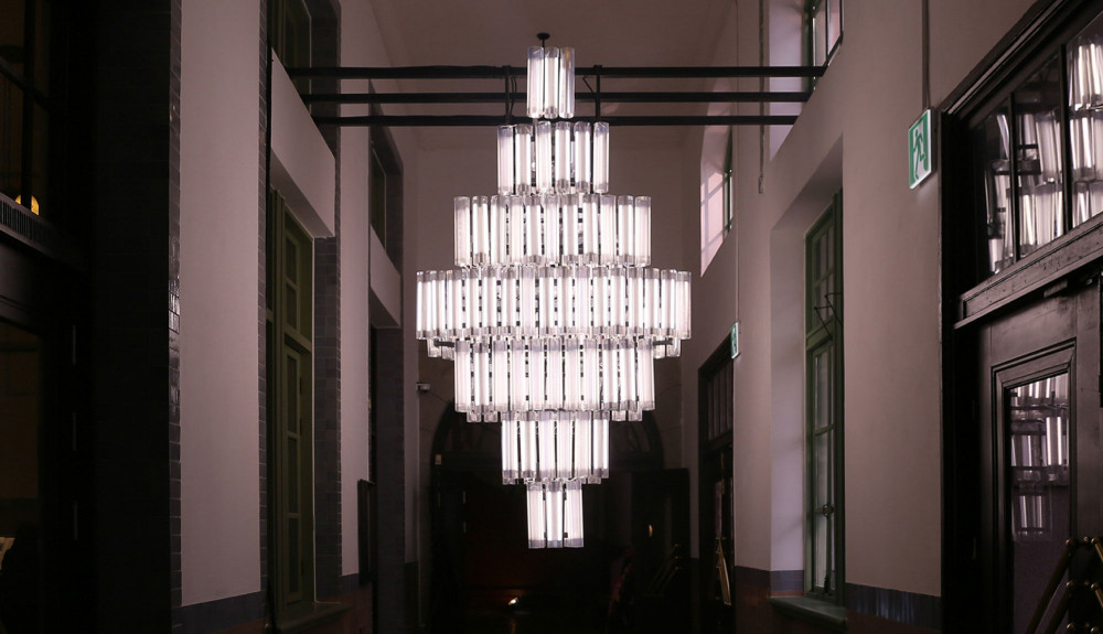 SWNA's 'Cluster of Light' reimagines the traditional chandelier design with modern materials such as T5 lamps and lenticular film, resulting in a simple yet dramatic lighting effect that expresses both the symbolism and modernity of hotel culture.