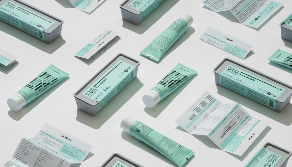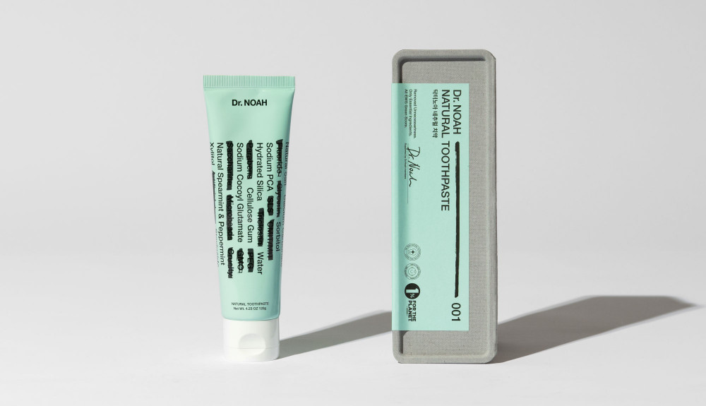 Dr.NOAH toothpaste reflects the brand’s philosophy of natural oral care, created by a dentist. The design, inspired by a "decisive dental chart," highlights the exclusion of unnecessary ingredients and focuses on natural and naturally derived components.