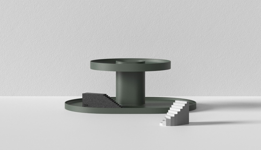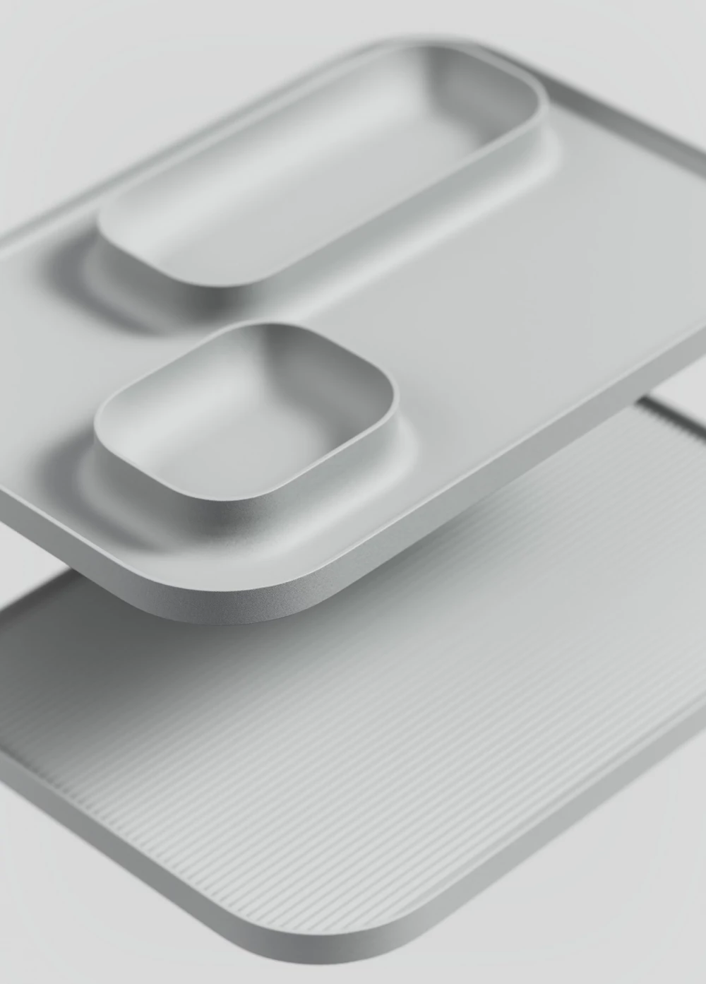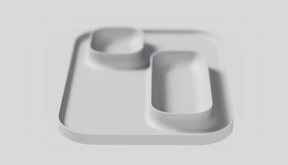 The JAJU Tray Series consists of a set of trays based on basic geometric shapes: a round tray, a square tray, and a two-tiered tray. These trays include compartments created by derived shapes acting as dividers. When flipped, each tray transforms into a plate with a raised base, with the dividers serving as the plate's support structure.