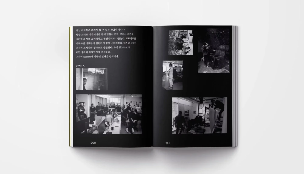 SWNA의 아이디어 스케치와 구현 과정, 재료 선정과 기법 탐구, 결과물을 찍은 다양한 사진과 이미지들이 담겨 있으며, SWNA가 생각하는 디자인에 필요한 7가지 핵심을 엿볼 수 있다.