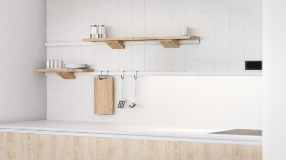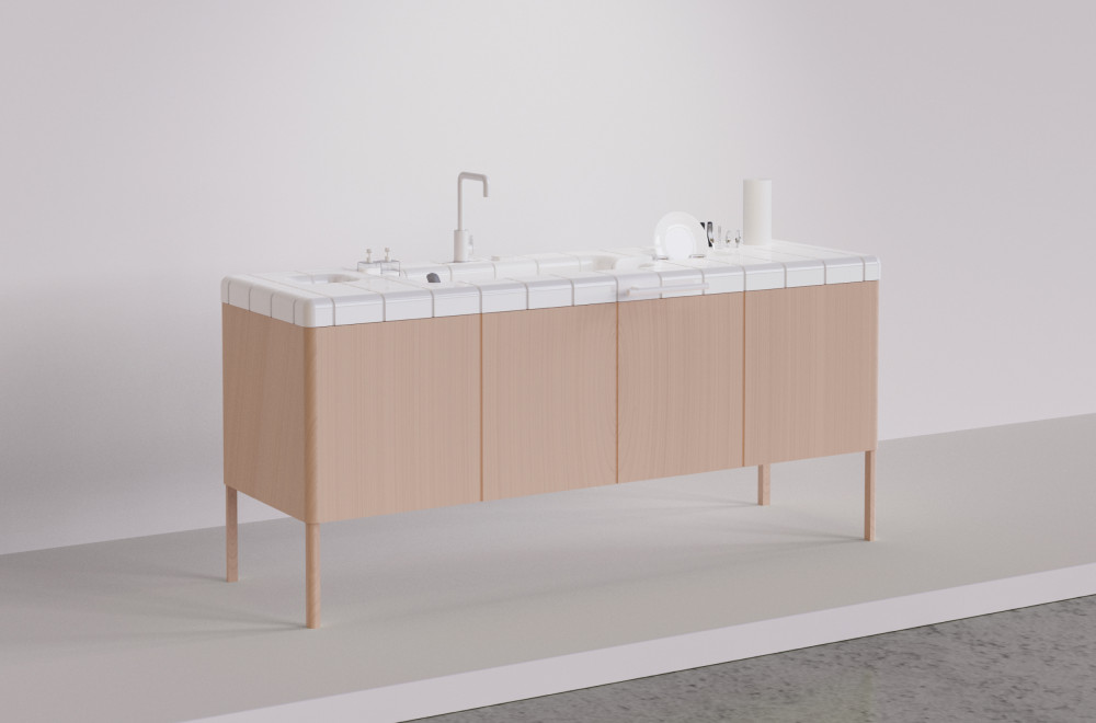 여섯 종류의 타일과 3D 프린트된 주방 액세서리 모듈로 이루어진 구성으로, 벽면에 균형 있게 배치되도록 디자인되었다. 점, 선, 면의 비례와 균형감을 중점적으로 고려하여 시각적 조화와 실용성을 모두 살린 것이 특징이다.