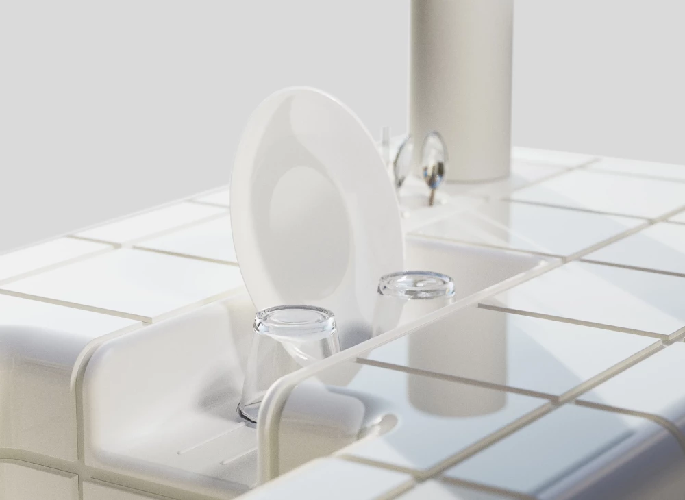 부드러운 표면의 흐름을 강조한 이 주방 타일은 각진 모서리 없이 설계되어 주방 카운터탑의 새로운 형식을 제안한다. 사용자는 타일을 조합하여 자신에게 맞는 그리드를 구성할 수 있어, 다양한 공간 활용이 가능하다.