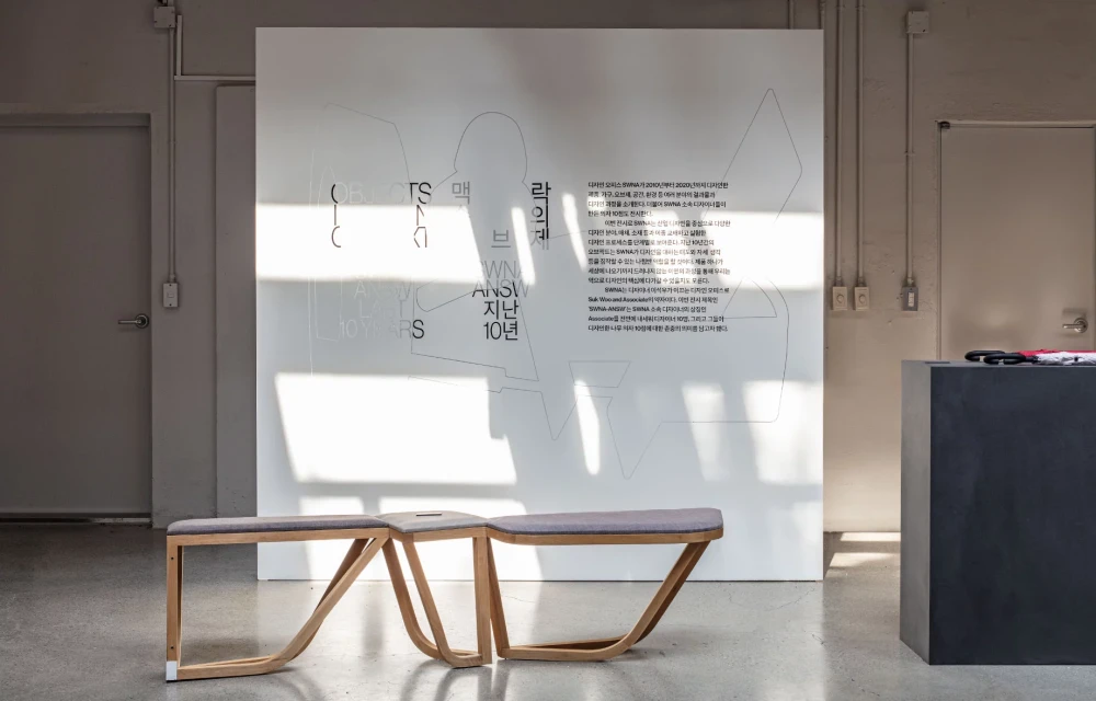 Led by designer Sukwoo Lee, the name SWNA stands for "Suk Woo and Associates." The exhibition title, "SWNA-ANSW," honors the contributions of ten designers and their ten chairs, emphasizing the importance of "Associates" as SWNA's collaborators.