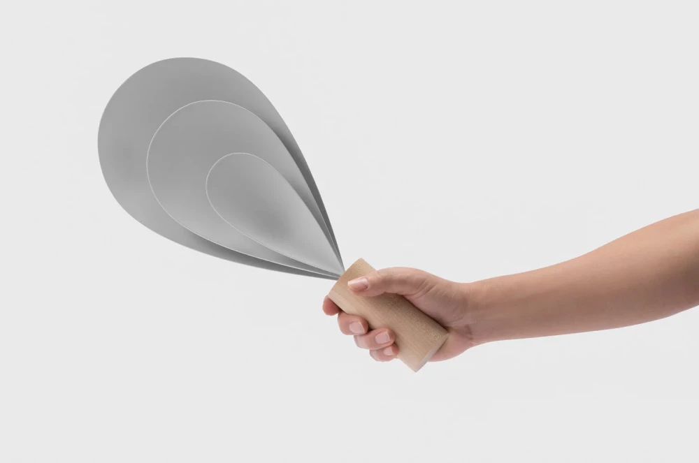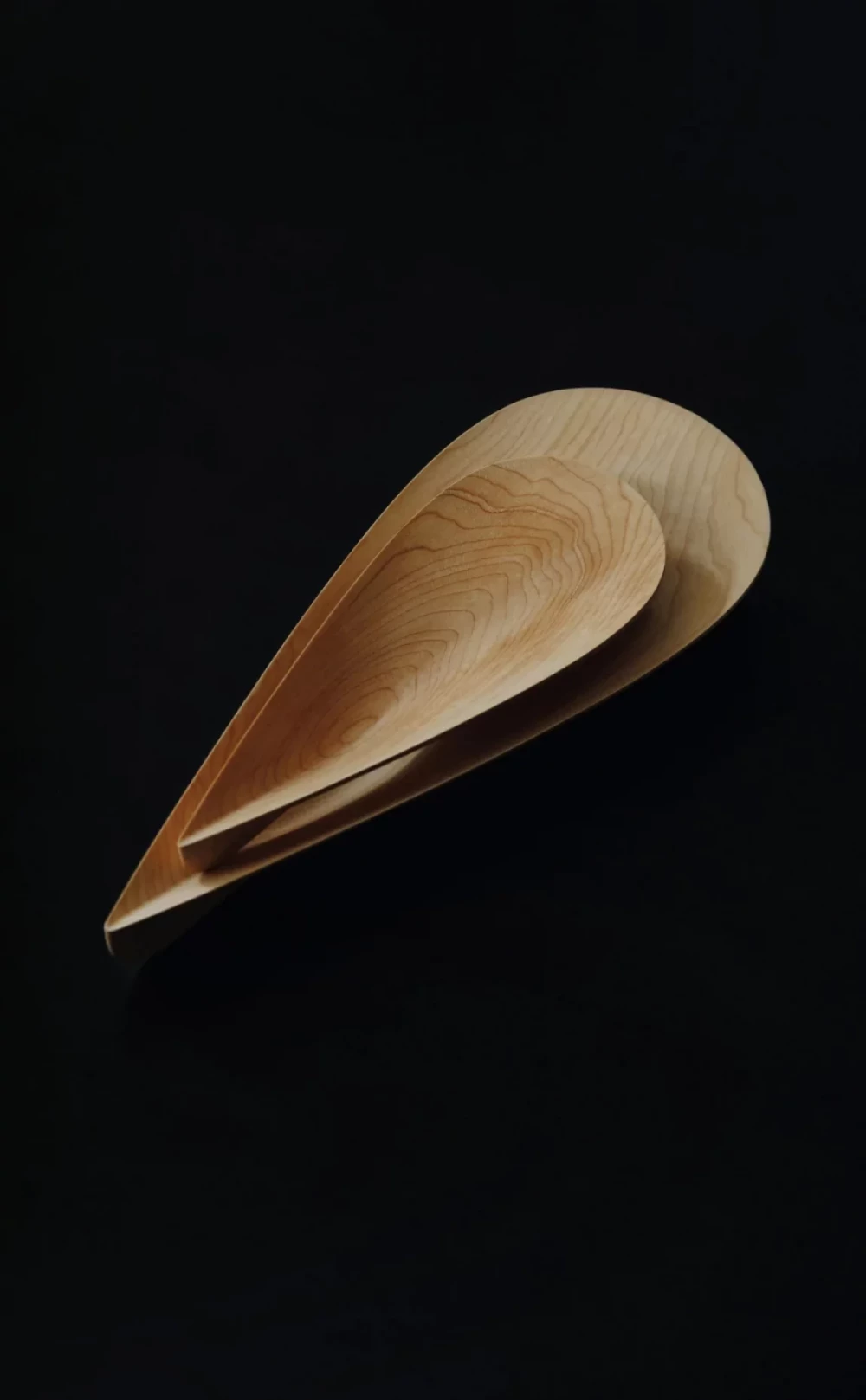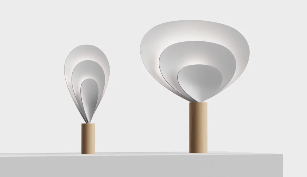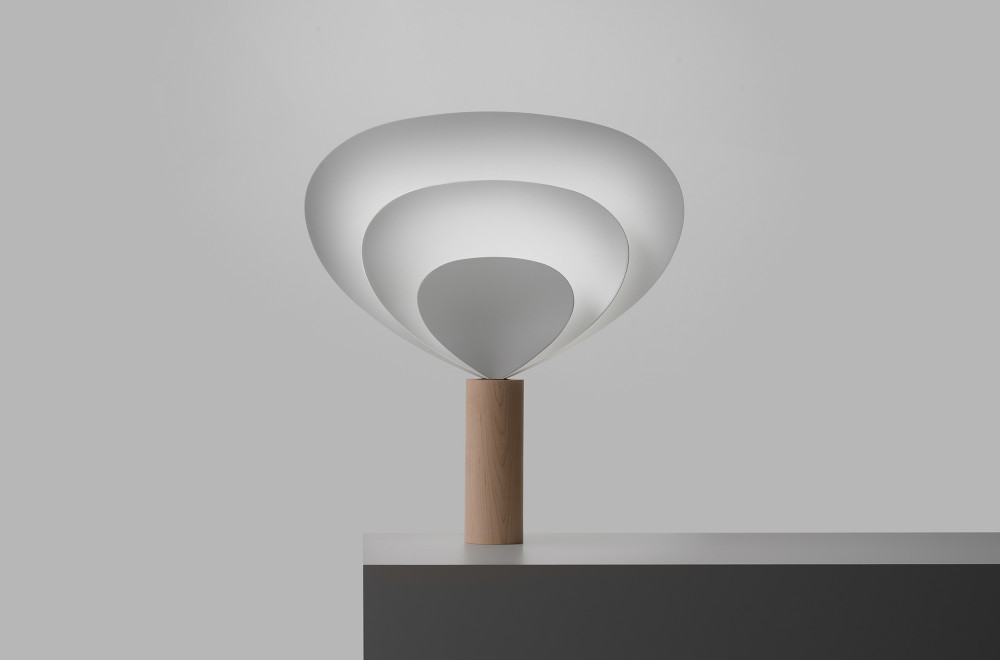The light expresses the three-dimensional changes of intersecting lines, and the initial sketches focused on exploring 2D sculpture. Through various experiments and prototypes, two forms of the drop light were finally designed. The shade, which features a fluid transition of curves and planes, is combined with a solid wood in the form of a column, creating a delicate and harmonious sculpture.