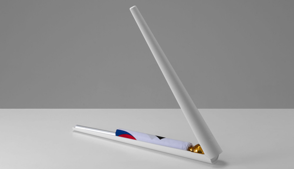 When the flag box is opened and the flag pole is inserted, it forms a tripod structure that can stably hold the flag, and is designed to blend into the environment even when not in use.