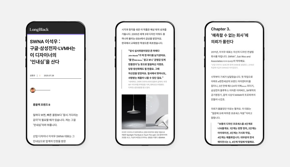 SWNA 이석우는 롱블랙과의 인터뷰에서 탁월한 일의 감각과 그의 디자인 철학 그리고 삶과 일에 태도에 대하여 이야기하였다. 창의적인 사고를 위한 몸과 마음의 자세와 균형, 일상에서의 영감을 얻기 위한 노력들에 대하여 다양한 시선으로 생각을 공유하였다.
