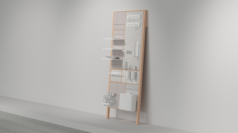 여섯 종류의 타일과 3D 프린트된 주방 액세서리 모듈로 이루어진 구성으로, 벽면에 균형 있게 배치되도록 디자인되었다. 점, 선, 면의 비례와 균형감을 중점적으로 고려하여 시각적 조화와 실용성을 모두 살린 것이 특징이다.